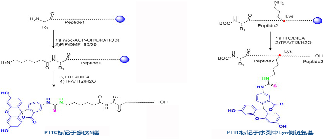 FITC標(biāo)記 FITC(異硫氰酸熒光素)具有比較高的活性,我們公司可以通過(guò)兩種方式將FITC標(biāo)記于多肽 上:(1) 將FITC標(biāo)記于賴氨酸(Lys)或被選擇性地脫保護(hù)的鳥(niǎo)氨酸(ornithine)側(cè)鏈氨基 上;(2) 將FITC標(biāo)記于多肽N端氨基。